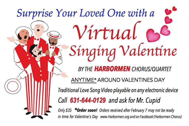 Thanks to COVID and the omicron surge we are still not ready to sing in person for your Valentine - but you can order a virtual quartet or full chorus song for your loved one anyway. See image for details.